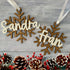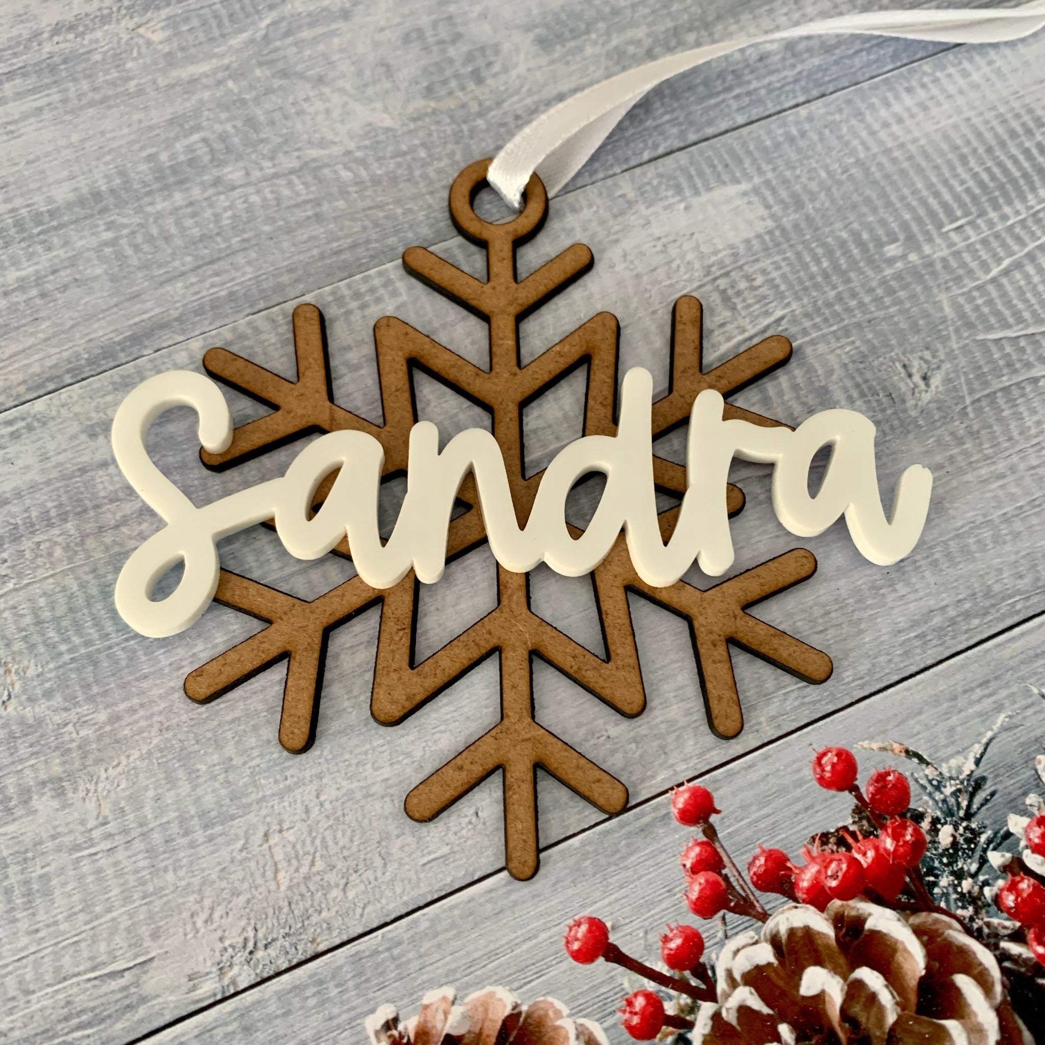 Hecho de madera con troquel dibujando un copo de nieve, con nombre personalizado en relieve de metacrilato blanco, dándole un toque único y elegante a tu decoración navideña.