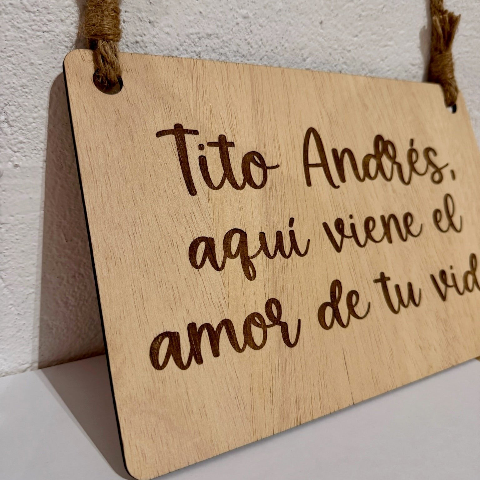 Con la frase grabada "Aquí viene el amor de tu vida", este cartel colgante es una manera especial de dar la bienvenida a tu pareja en el altar.